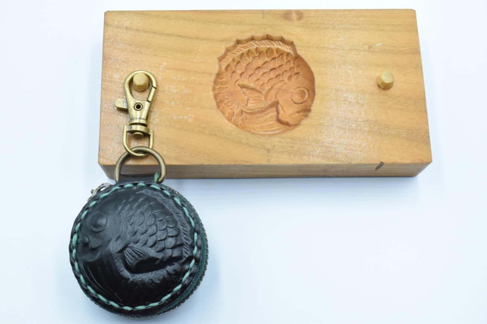 通常たい焼きレザー作製では、数個の『万力』を用いて人力で締め上げて作製します。g-factoryでは、より「くっきり」、より「はっきり」、「頭からしっぽ」までたい焼き型が出るよう『だるまジャッキ』を用いて油圧で締め上げて作製しております。