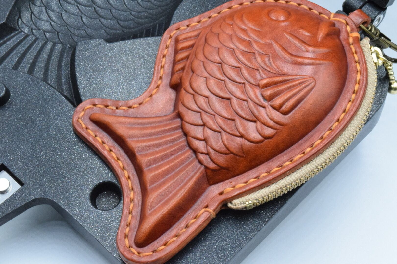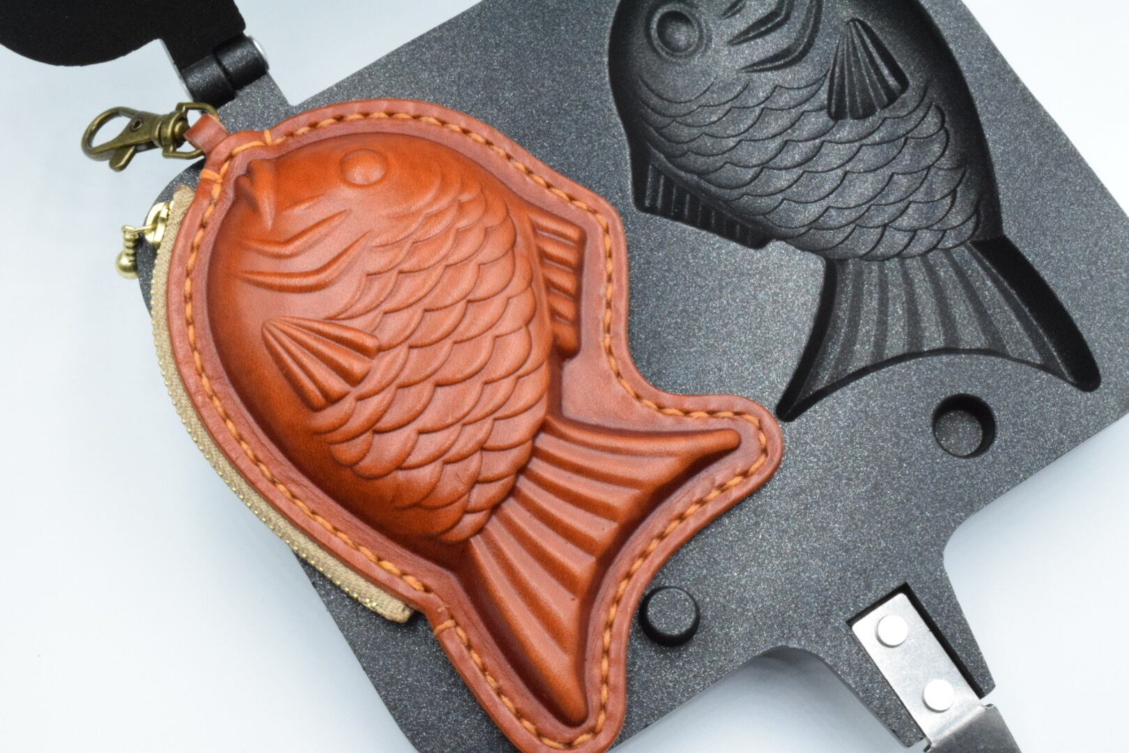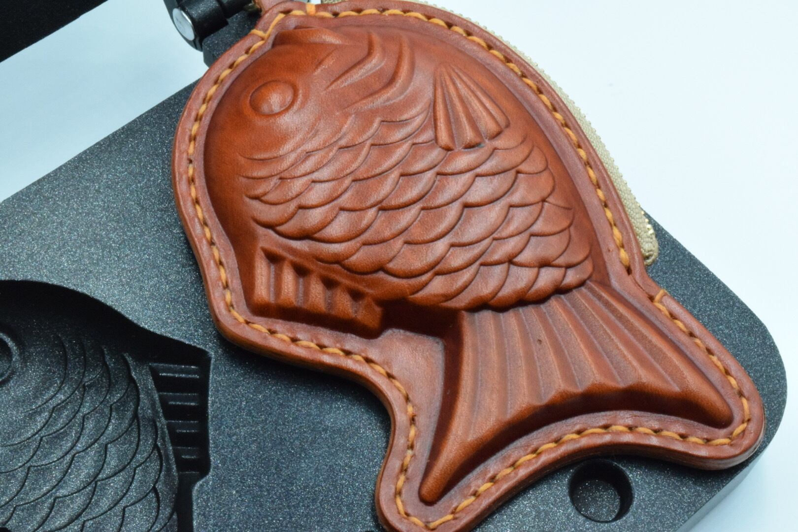 通常たい焼きレザー作製では、数個の『万力』を用いて人力で締め上げて作製します。g-factoryでは、より「くっきり」、より「はっきり」、「頭からしっぽ」までたい焼き型が出るよう『だるまジャッキ』を用いて油圧で締め上げて作製しております。